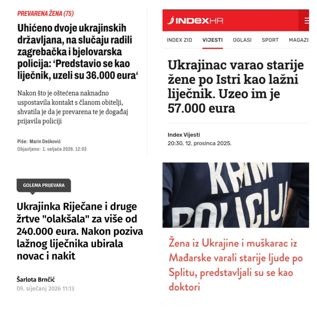- Prosinac 2025 – Ukrajinac (38), osumnjičen da je prevario 17 starijih osoba i oštetio ih za 150 tisuća eura predstavljajući se kao liječnik i uzimajući novac i nakit za navodne troškove liječenje članova njihovih obitelji. Uhićen je na području Primorsko-goranske županije i predan pritvorskom nadzorniku virovitičko-podravske policije. Iz PU potvrdili su sumnju da je Ukrajinac počinio 17 kaznenih djela prijevare na istarskom području, četiri na području virovitičko-podravske županije, po dva na ličko-senjskom i zadarskom području te po jedno na područjima karlovačke, međimurske i sisačko-moslavačke policijske uprave.